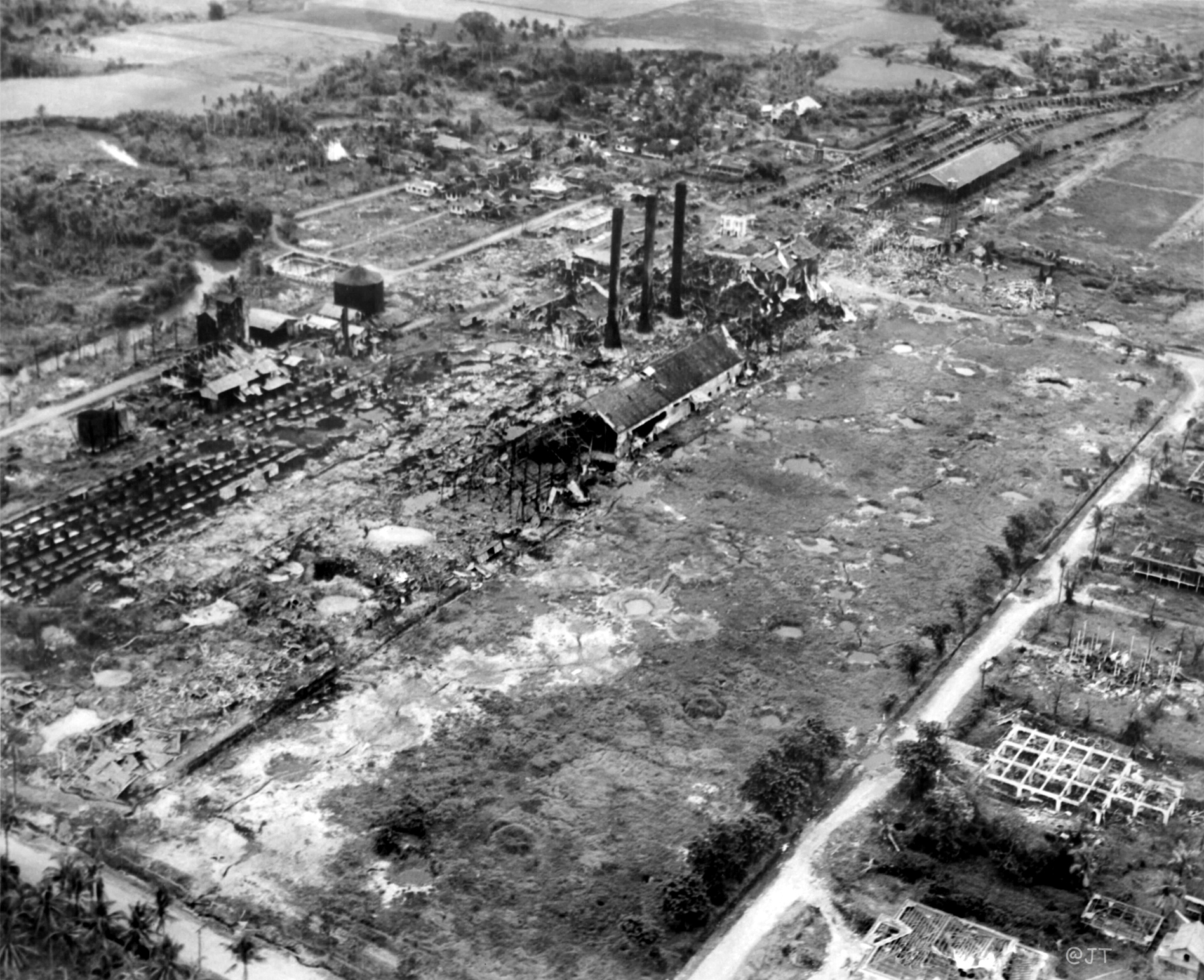 As such, two weeks after the division's famous raid on the Los Baños internment camp (February 23, 1945) wherein over 2,100 civilians were rescued from behind enemy lines, CPT Cavanaugh’s exhausted D Company went back into regimental reserve after patrolling Mamatid on March 7 (X+35) then calling in air strikes on enemy troop concentrations and supply dumps around Santa Clara on March 8 (X+36). Two days later Dog Company found themselves in the town of Real at an abandoned sugar mill at Sugar Central’s Calamba estate, or what was left of it (pictured right), along Highway 1 (now Route 3). After the hells of combat in Manila, the commercial installation, while heavily damaged, was a place to rest.