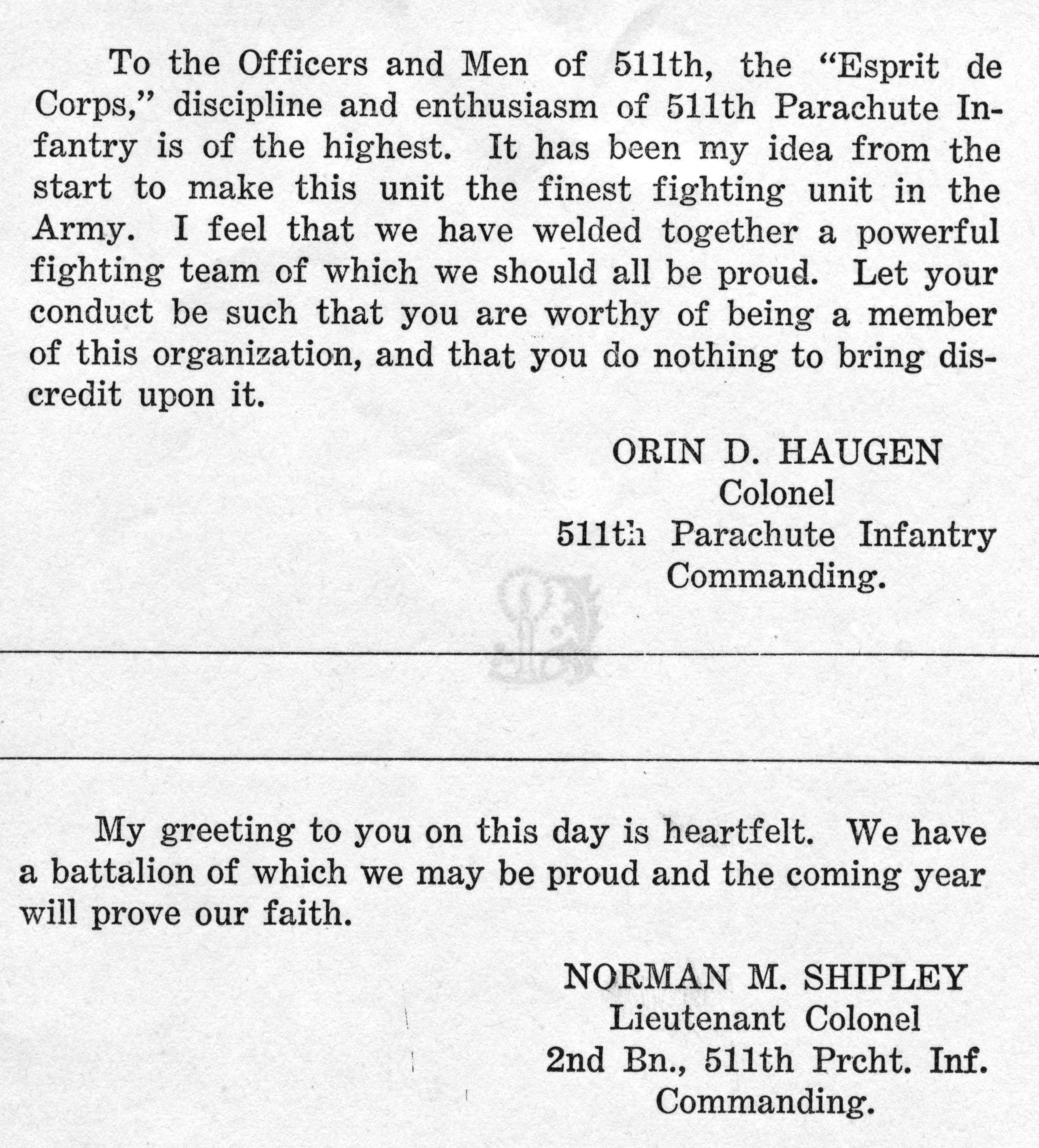 1. Pvt. Sidney Smithson, B/511, letters to friend - Toccoa, Benning, Mackall - Jan-June 1943 2. VMail from Pvt. James M. Massey, G/511, to parents - New Guinea - June 19, 1944 3. 1LT Andrew Carrico (D/511) to his wife Lois Lilly Carrico - Leyte, December 1944 4. 1LT Carrico (D/511) from 1LT Rudy J. Walter (D-Day Normandy/WIA) - Dec 1944 & Feb 1945 5. US Sixth Army Letter to West Point Class of 1930 RE: interment of Colonel Orin D. Haugen 6. 5x Letters from Sgt. Martin L. Squires to LTG Edward M. Flanagan 1984-1986 7. Letter from Sgt. Martin L. Squires to Maj. Henry Burgess 1984