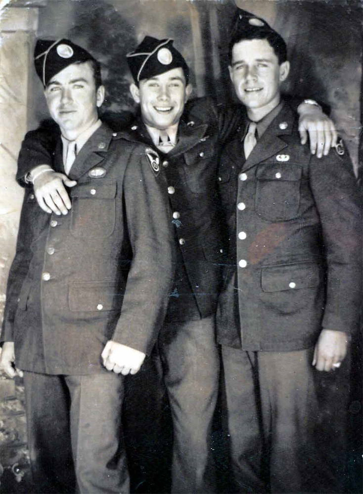 Photo at right: Pfc. James Kennedy, Pfc. Joseph "Joe" Miller and Pfc. Elmer Hudson with new Jump Wings. Taken at Camp Polk, LA. Photo courtesy of Jane Carrico.