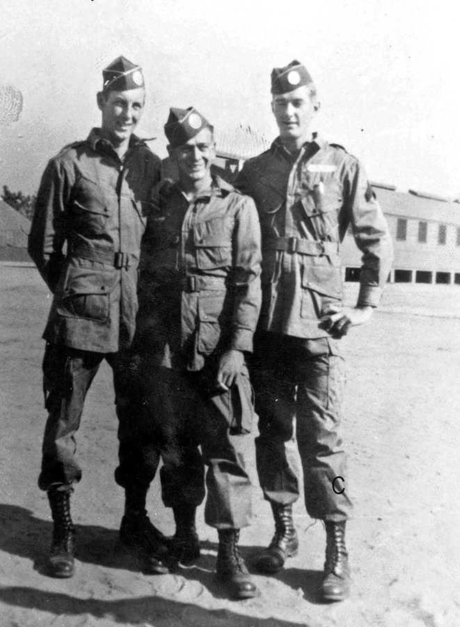 Photo at Right: L to R: "Kurt", Pfc. Joseph W. Vernon, Cpl. William R. Walter. Taken at Camp Mackall. Photo by William R. Walter.