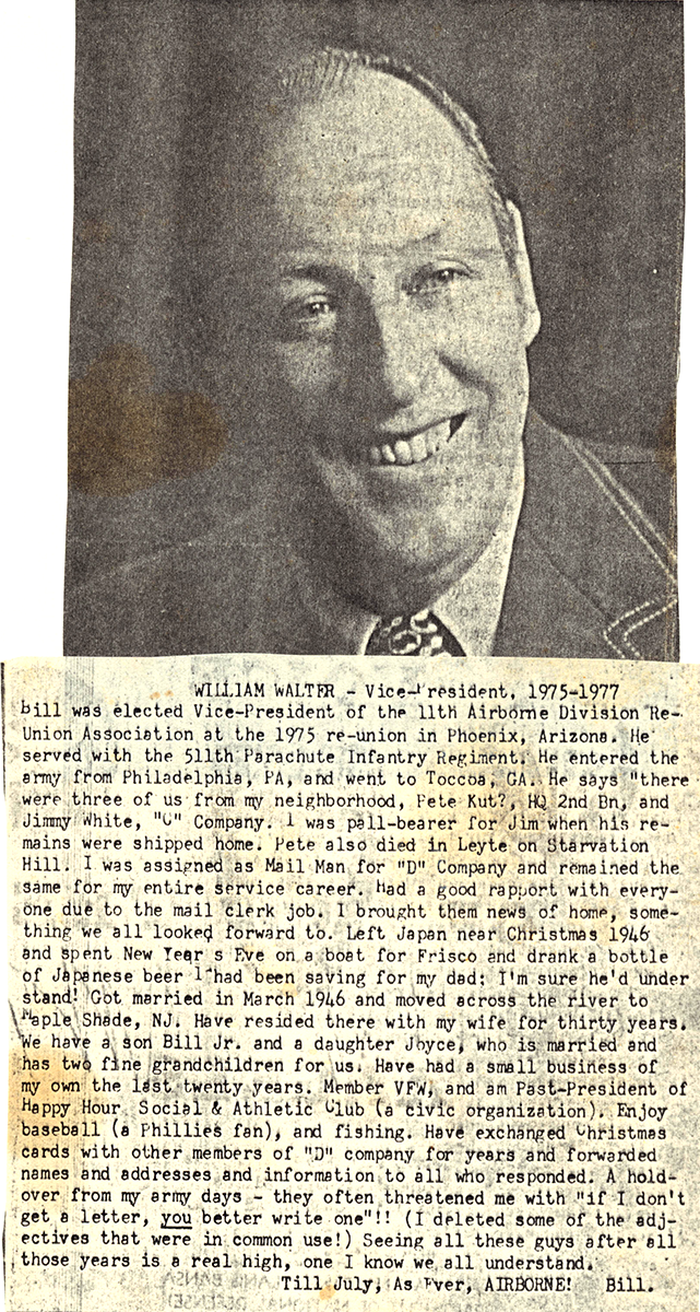 Bill Walter was active after the war. He was elected Vice-president of the 11th Airborne Division Reunion Association 1975 – 1977.