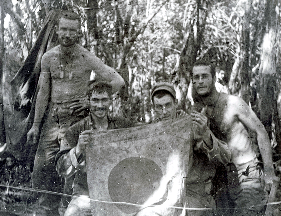 Photo at Right: L to R: Cpl. Richard L. Matheny, T/5 George R. Lock, Cpl. William R. Walter, S/Sgt. Howard C. Moshier with Japanese "Trophy" battle flag. Taken on Leyte. Photo by William Walter.