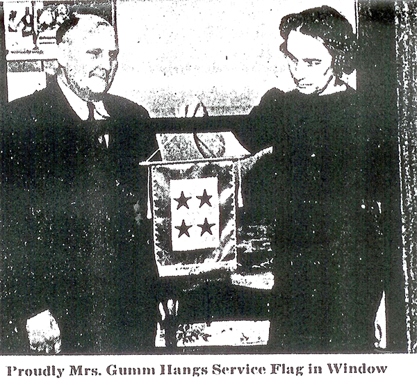 The Gumm family is very proud of their boys, and their mother finds time from her letter-writing to the boys to volunteer for the Red Cross, operating the county First Aid station. His parents are shown in the following photograph hanging their four star flag for their sons in World War II.