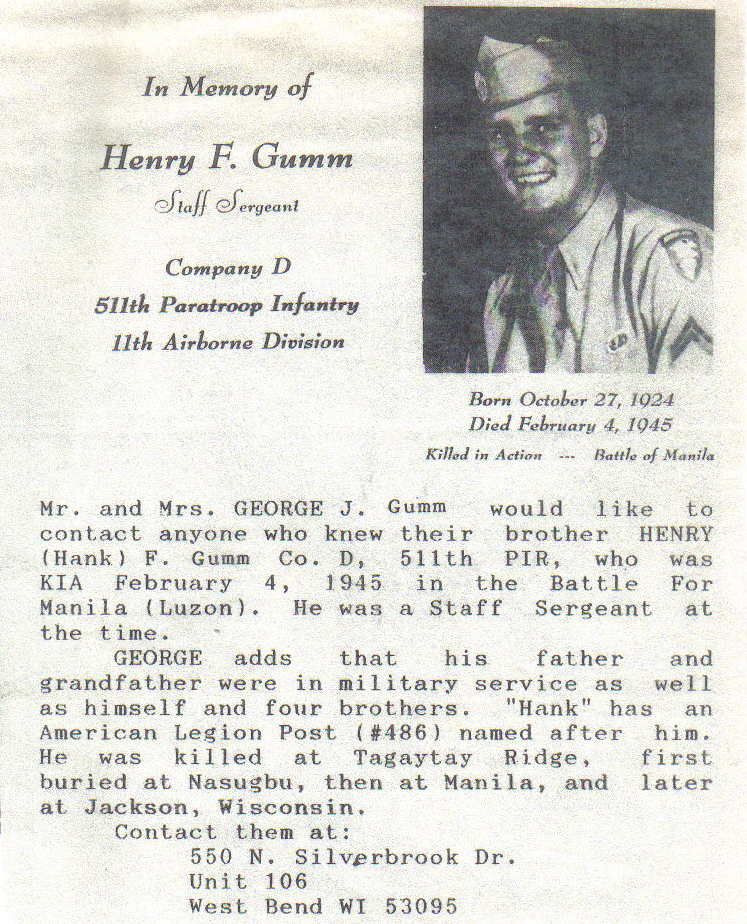 Staff Sgt Gumm was in the battle of Leyte Gulf, and was killed at Imus, Luzon on February 4, 1945 during D Company's battle for a stone courtyard. A copy of a condolence letter signed by General Douglas MacArthur follows (see below).