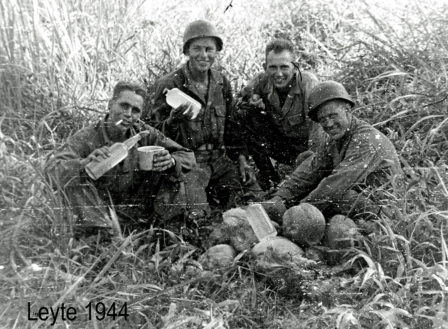Photo at Right: L to R - Pfc. Lesley E. Valentine, T/Sgt. Edwin Sorenson, S/Sgt. Leonard Klein, Pfc. Charles B. Williams share drinks of coconut water near Mahonag, Leyte. Photo by Pfc. Norman Zadoorian