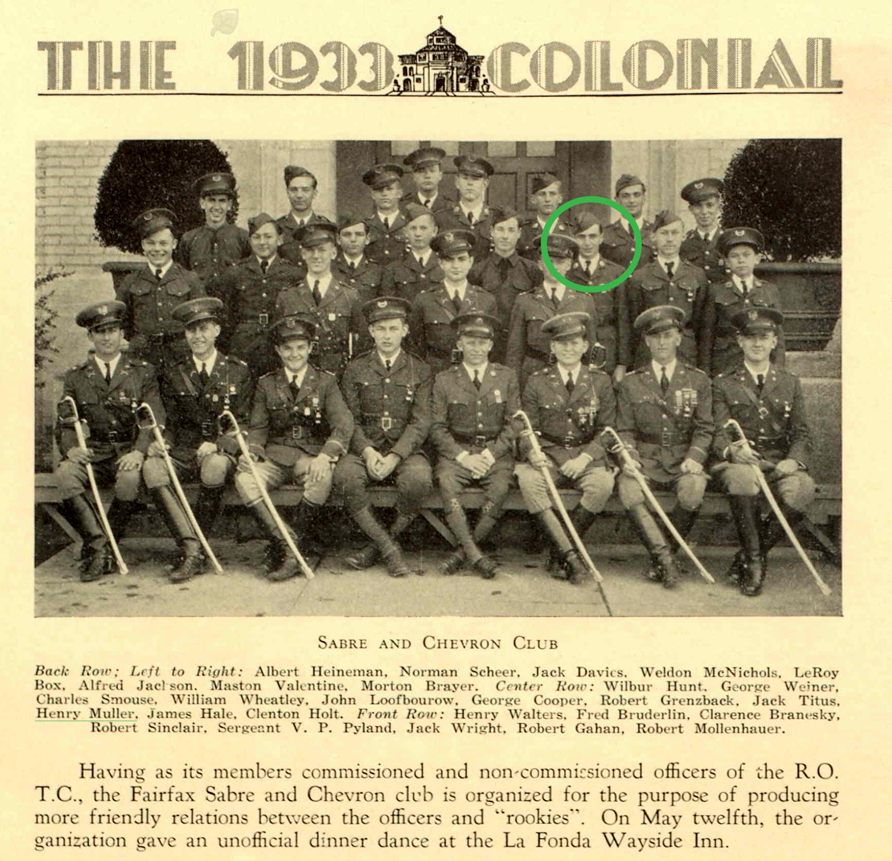 Henry Muller's Fairfax High School yearbook for 1933 listing Henry as a member of the Sword and Chevron ROTC club
